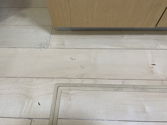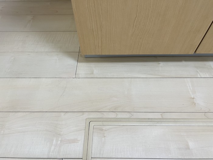 一戸建て住宅のキッチンの足元のフローリングに傷が5ヶ所ほどありました。