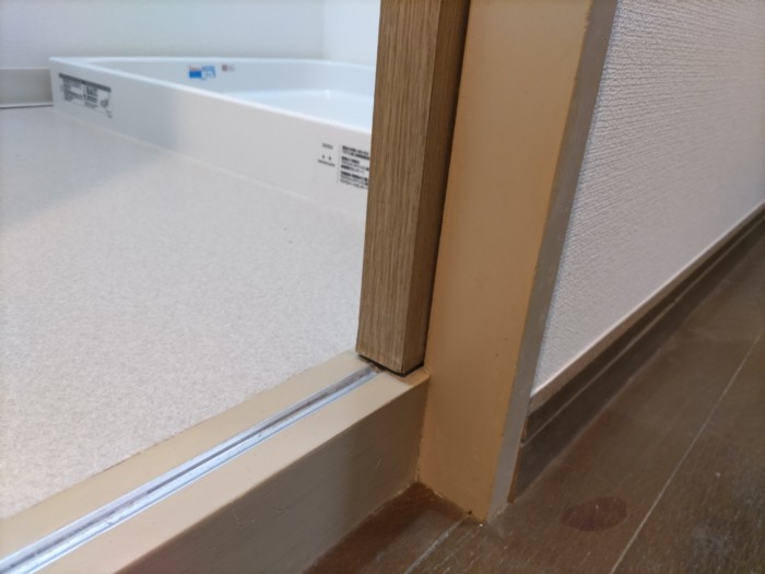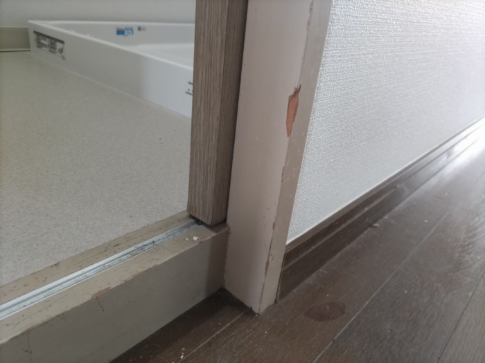 賃貸アパートの洗面所に入るところの建枠と敷居にえぐれ傷がありました。
