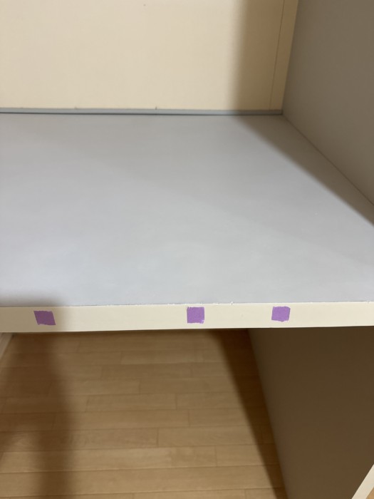 他の2ヶ所の傷もパテを埋めて、乾燥後平らにしたあと 中段には全体的にシミがありましたので、棚板を全塗装しました。